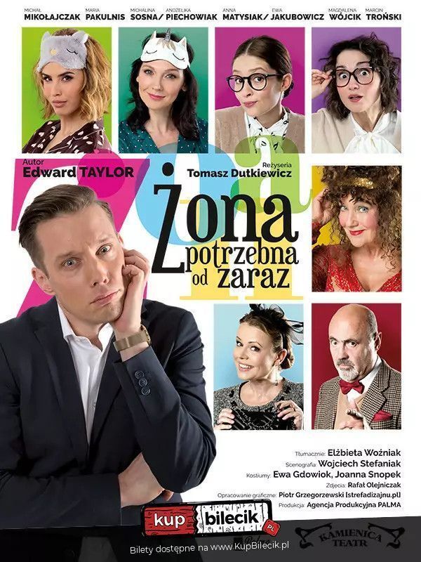 Bilety do nabycia na: KupBilecik.plBo któż inny jak nie czarująca, dobrze wychowana i inteligentna żona potrafi pomóc mężczyźnie w uzyskaniu upragnionego awansu? Co jednak zrobić, kiedy żony brak, a konserwatywny szef wraz z małżonką mają zjawić się na kolacji, by poznać panią domu? Lekkoduch i karierowicz (Michał Mikołajczak), piękna i nieco rozdrażniona narzeczona (Michalina Sosna/Andżelika Piechowiak), nieprzewidywalna i dość bezczelna pomoc domowa (Maria Pakulnis), uroczo nieporadna asystentka (Anna Matysiak/Ewa Jakubowicz) oraz małżeństwo z zasadami i upodobaniem do wyskokowych trunków (Magdalena Wójcik i Marcin Troński) stworzą na scenie widowisko pełne humoru i nieprzewidywalnych zwrotów akcji.