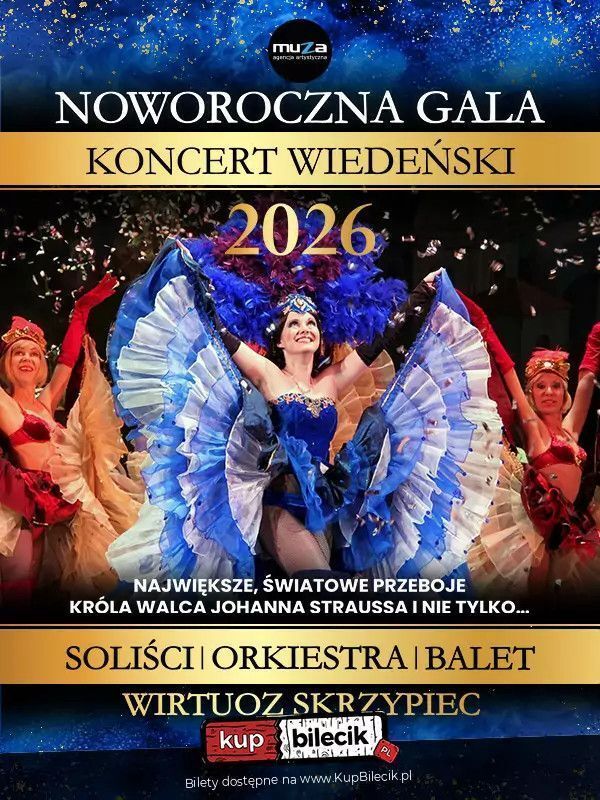 Noworoczna Gala - Koncert Wiedeński został stworzony z potrzeby połączenia najwyższej klasy profesjonalizmu i serca natchnionego muzyką. Noworoczna Gala dzięki swojej wyjątkowości pozwoli zbliżyć się do tradycyjnego koncertu galowego w Wiedniu, pełnego szelestu błyszczących sukien, wśród widoku rozlewanego szampana i odgłosu stukających obcasów. Zapraszamy w tę wspólną, ponad dwugodzinną, podróż muzyczną! Bilety do nabycia na: KupBilecik.pl